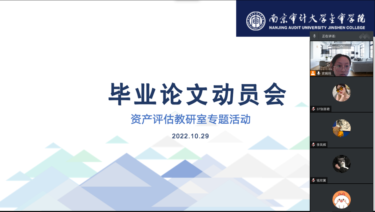 资产评估专业会议由史婉玲老师主持,她针对毕业论文指导教师安排、开题报告撰写、毕业论文初稿提交要求等内容进行了详细的讲解,会议最后部分同学根据自己存在的疑问进行提问,老师针对这些提问进行了解答。