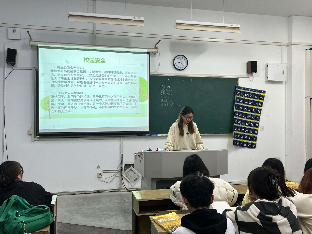 各班级负责人条理清晰地就同学们如何做好各项安全预防措施进行了深入浅出的讲解,让同学们认识到安全事故的危害性。为了加强德育,使学生提高其自我约束力,养成良好的学习习惯。各班都强调了迟到早退,出勤率及上课听讲纪律等行为规范,要坚持集中日常教育的原则。其次,班会上向同学们介绍了宿舍卫生内务要求,强调在宿舍生活中不要违反宿舍纪律,如私拉电线和使用宿舍违禁物品等等,共同打造一个有利于学习的良好宿舍环境。最后,各班负责人严重强调了请假销假制度的变更问题,每位同学按照要求严格遵守请假流程,重点强调请假销假要附上凭证,请假的学生要跟班长和生活委员报备,确保班委能够追踪到每位同学的出行情况。