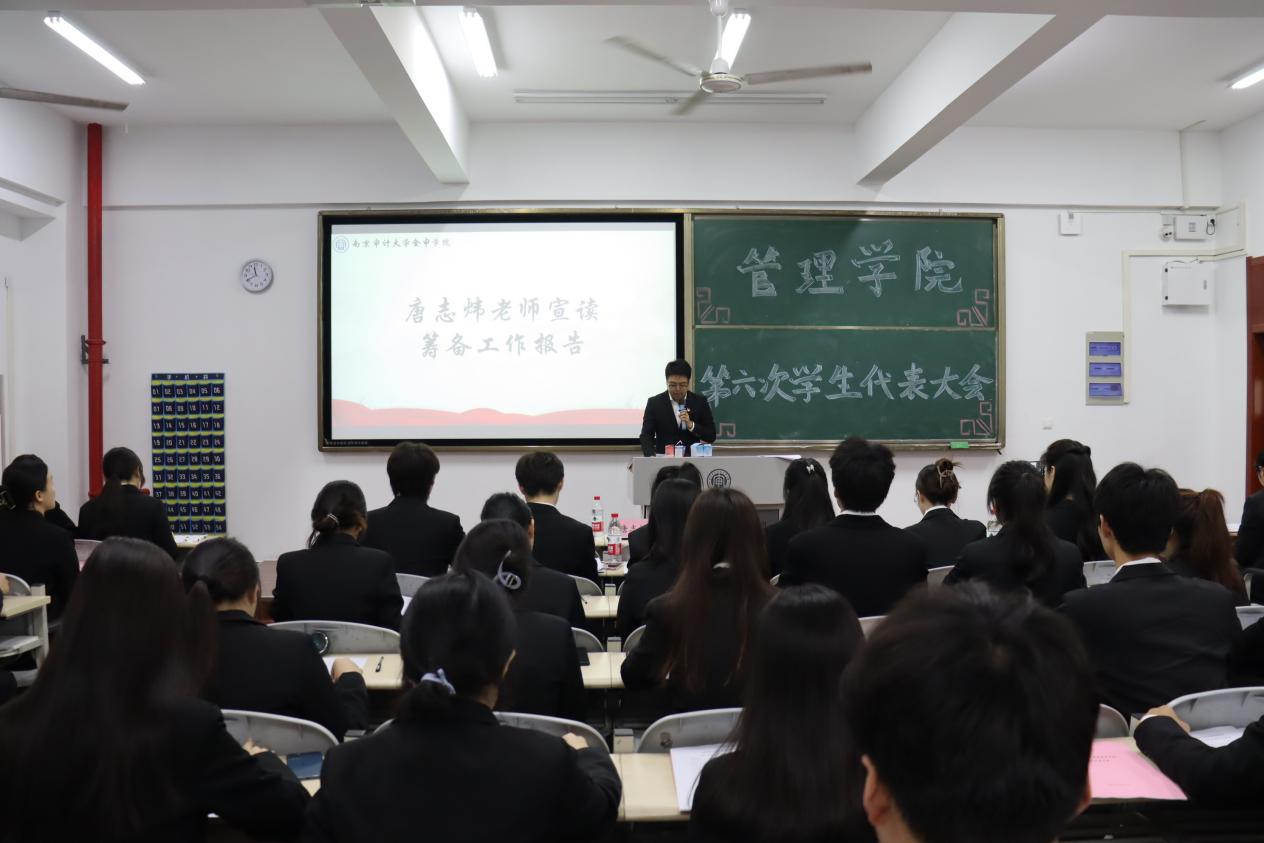 接下来,唐志炜老师宣读大会的筹备情况以及大会代表资格审查报告,本次学生代表大会大会筹备过程中,管院学生会充分酝酿,全面考察,选举产生大会代表和委员候选人,筹备委员会在本次工作中精益求精,追求完美,尽己所能为学代会的顺利举办保驾护航,希望各位与会代表能够带领全院广大青年学生,为建设和谐校园奉献青春力量。