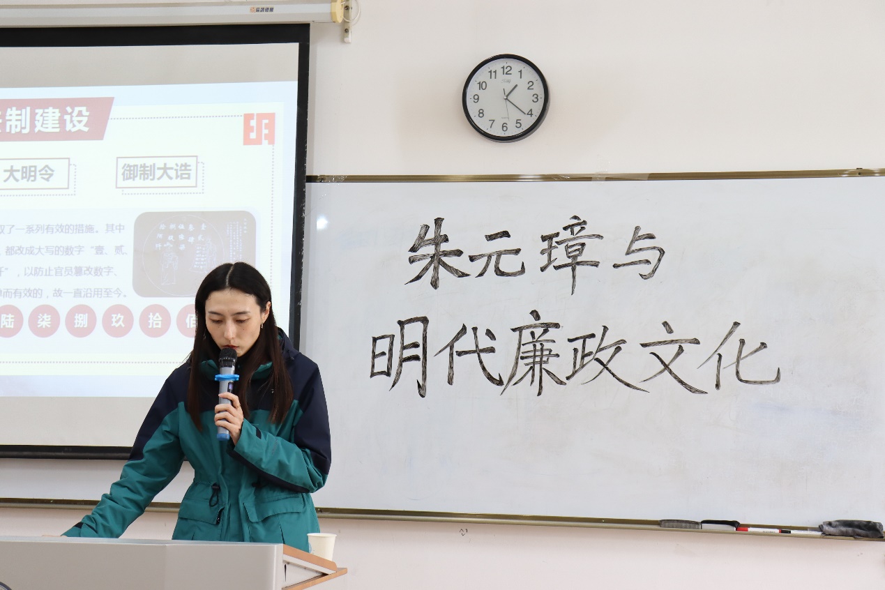 岁月峥嵘,山河为证;文脉悠远,与古为新。朱元璋与明代的廉政文化承载清廉价值,弘扬崇廉风尚,无形而有质,温润而持久。为将明代廉政文化充分发挥以文化人、润物无声的宣传教育功能,WilliamHill中文于12月6日在B中503开展“朱元璋与明代廉政文化”讲座,明孝陵博物馆资深讲解员张垚老师主讲。