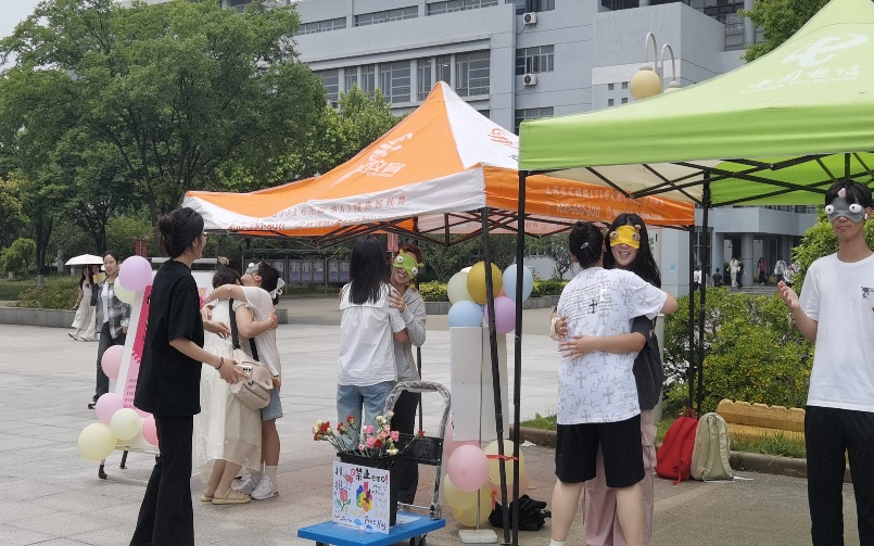 活动开始后,志愿者们戴上了可爱的眼罩,张开着手臂,等待着每一个向她们走来的“拥抱”。鲜花与气球点缀了石头广场,营造了一个充满爱与温暖的环境。我们通过拥抱的方式,满足同学们对倾诉、关怀和爱的心灵需求,以营造和谐温暖,向上向善的校园氛围。