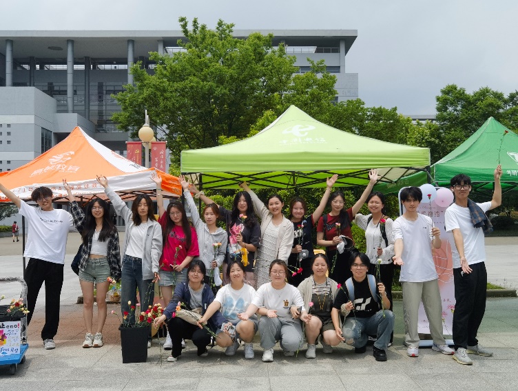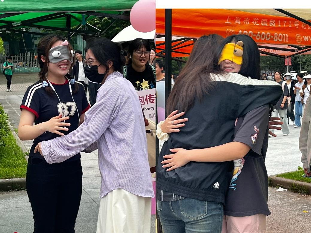 活动开始后,志愿者们戴上了可爱的眼罩,张开着手臂,等待着每一个向她们走来的“拥抱”。鲜花与气球点缀了石头广场,营造了一个充满爱与温暖的环境。我们通过拥抱的方式,满足同学们对倾诉、关怀和爱的心灵需求,以营造和谐温暖,向上向善的校园氛围。