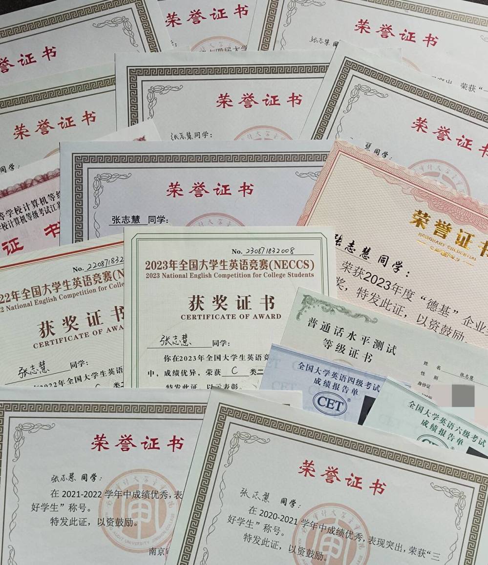 张志慧,2001年生,江苏盐城人,共青团员,2020级行政管理1班学生。入学以来获得校级一等奖学金、校级二等奖学金、“德基”企业奖学金二等奖、全国大学生英语竞赛C类二等奖、三好学生、第十四届大学生“时代新人”综合素质先进典型、优秀团员、优秀志愿者、“词达人”校赛一等奖等荣誉。大学学习期间获得江苏省计算机二级证书、英语四六级证书、普通话二级甲等证书、教师资格证、上海英语中级口译笔试证书。