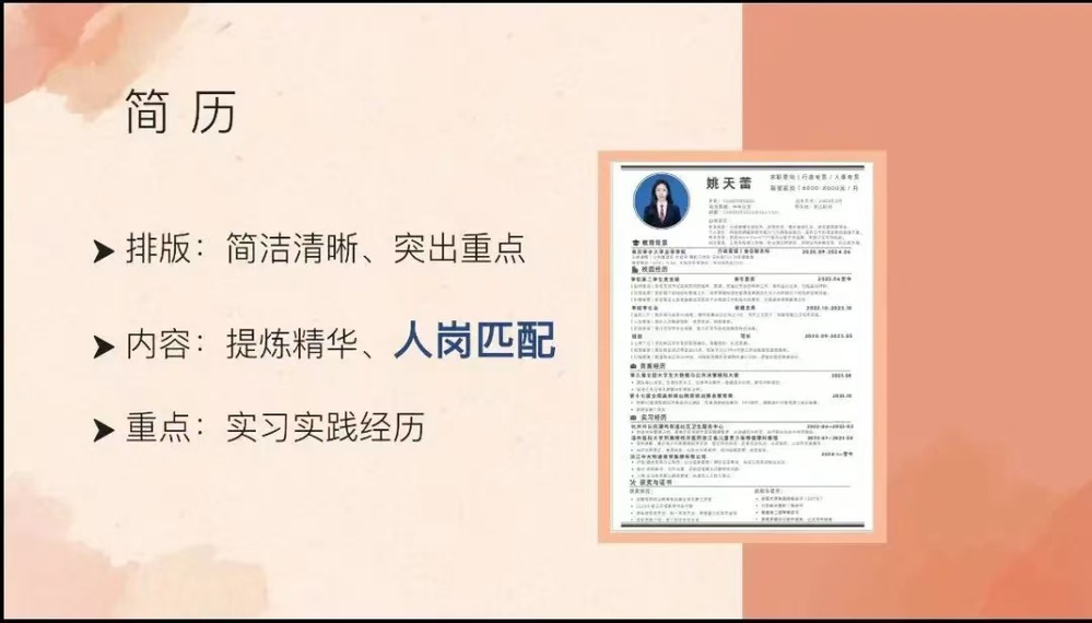 姚天蕾说:“在我初入大学校园,我的老师与辅导员助理以及学生会的学长学姐用他们的热爱影响了我,那么我也想将这份热爱,这份初心传承下去。”她在优秀毕业生经验交流大会上分享了求职路上的三大重点一一选择、简历、面试。指明如何选择工作,重点介绍简历的制作和面试的过程,她强调不仅要在面试中沉着稳定还要注重面试后的总结和反思。她建议求职者在面试结束后及时总结自己的表现和经验教训,以便在后续的面试中不断改进和提高。