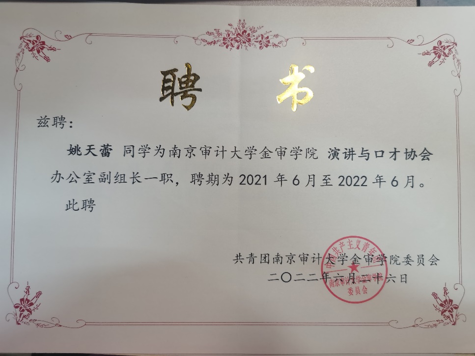 姚天蕾,浙江杭州人,2020级行管1班学生,曾任班级班长,2021级行管1班辅导员助理,校演讲与口才协会办公室副组长。现任williamhill中国第五届学生会委员会委员,WilliamHill中文学生会轮值主席。在校期间获得江苏省优秀学生干部,校二等奖学金、三好学生标兵、优秀团干部、优秀辅导员助理、优秀志愿者等荣誉。目前已通过全国大学英语四级与江苏省计算机二级,获得普通话二级甲等。