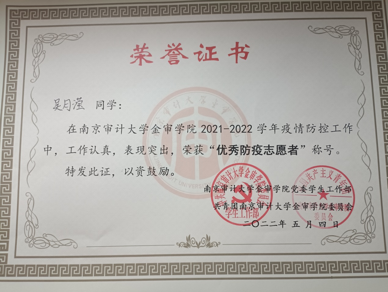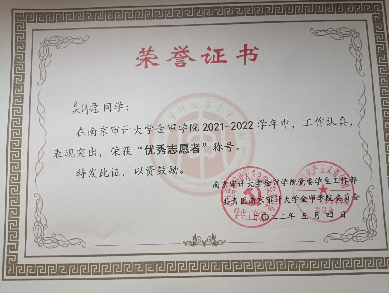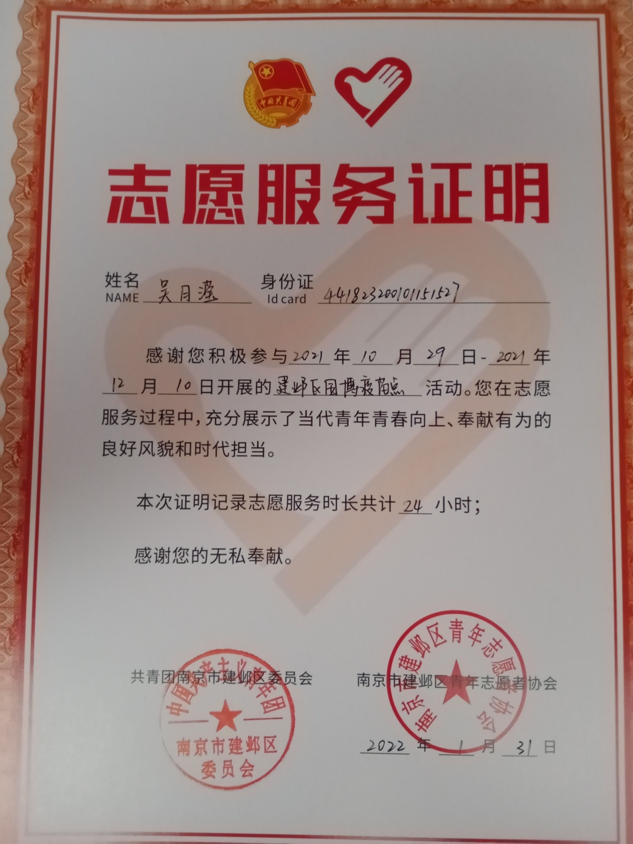 少年有梦,不应止于心动,更要付诸行动。吴月滢同学勤奋努力、成绩优异,90分以上科目超过30门,学分绩点3.6285,专业排名第三。她工作认真负责,作为班级学习委员配合好老师完成教学任务。她热心公益,多次参加南京国际博览中心、雨花斋等志愿服务活动。她主动投身社会实践活动,积极参加佛山市“阳光行动——青少年暑期成长计划”暑期社会实践,在社区参加服务时长达170小时。