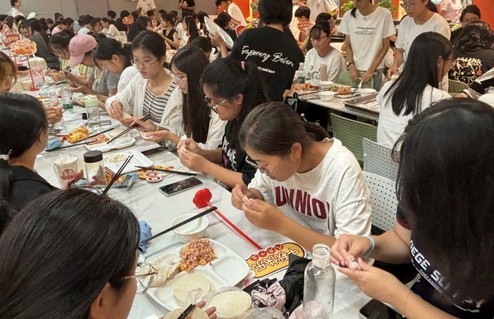 随后,大家开始了期待已久的包饺子活动。在老师和部分同学们的指导下,大家纷纷拿起筷子,夹起了不同的内馅,兴致勃勃地包起了饺子。虽然有部分同学的手法不够标准,动作不够熟练,但是在大家的互帮互助下,一个个可爱的,形状奇特的饺子逐渐诞生了。最后这些饺子都由食堂阿姨煮熟后送到了各位的餐盘中,每个人都在享受自己用心准备的劳动成果,脸上洋溢的都是幸福的笑容。