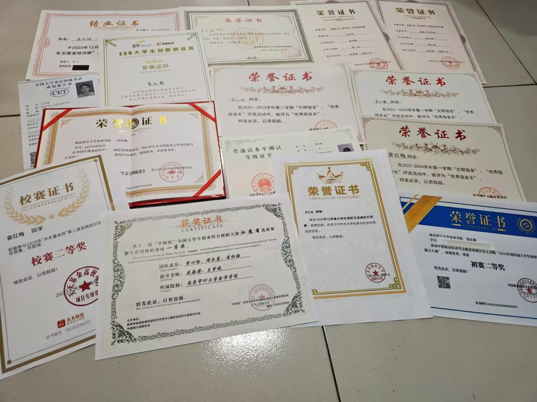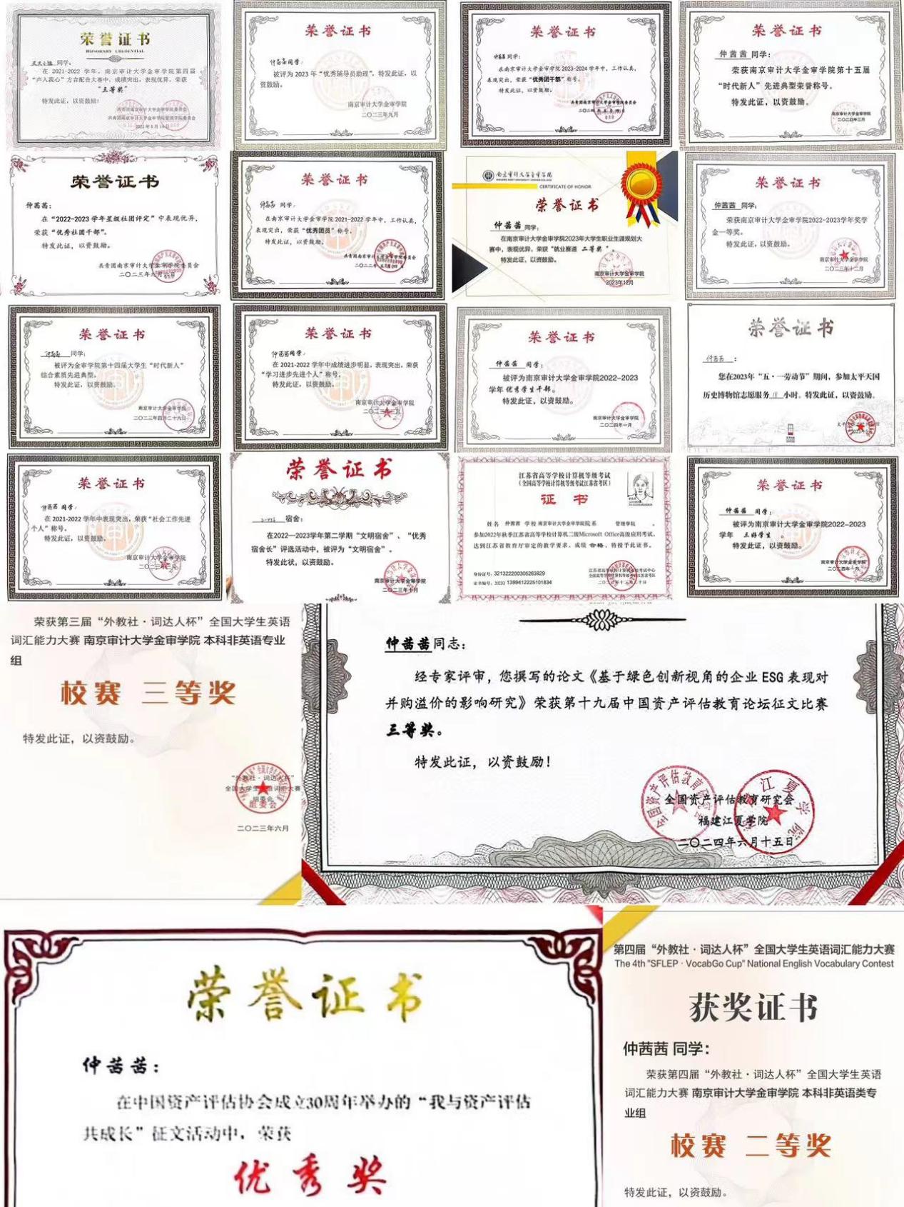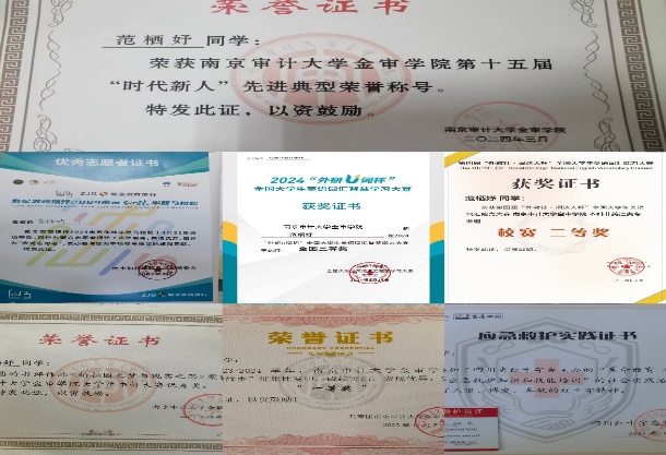 在学习、工作、生活上都能严格要求自己并取得了优异成绩,获校一等奖学金、“时代新人”综合素质先进典型、优秀团干部、三好学生、优秀学生干部、第十九届中国资产评估教育论坛征文比赛三等奖等荣誉。顺利通过江苏省计算机二级、英语四级考试、初级会计考试。