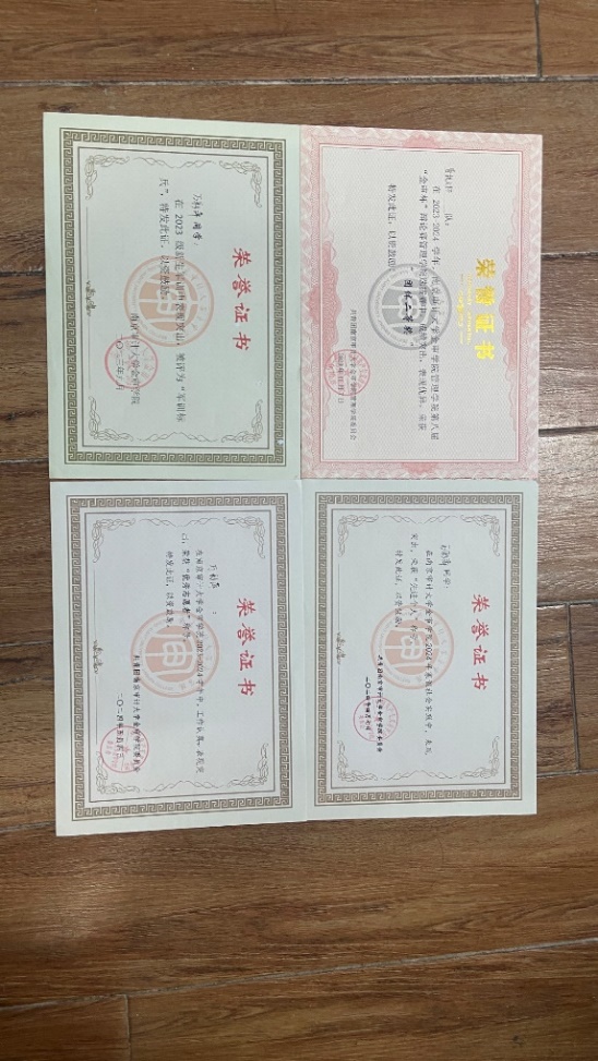 入学以来获得全国商业精英挑战赛二等奖,全国高校健身气功锦标赛二等奖,资产评估征文比赛优秀奖,吉安市寒假返家乡社会实践先进个人,并有一项省级大创立项并结项,校一等奖学金,德基企业一等奖学金,连续多次获得‘’优秀团员‘’、‘’优秀团干‘’、‘’时代新人‘’等荣誉称号。她热爱所学专业,积极参与各类科研及实践活动,不断提升自己的专业素养和综合能力。