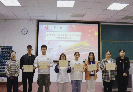 同时我院为激励同学们持续发扬爱国主义精神,并对积极参与本次活动的同学们予以表扬,10月15日,“我与红旗走山河”活动表彰大会于教学楼C中301成功举办,辅导员薛舒文老师,孙露老师参与了此次大会,对作品出彩的同学给予表彰并为其颁发奖状。大会有条不紊地进行,获奖同学依次领取奖状。最后镜头定格下了获奖同学与两位老师笑容,大会圆满结束。