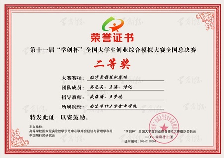 “学创杯”全国大学生创业综合模拟大赛为中国高等教育学会“全国普通高校大学生竞赛排行榜”A类赛事,至今已举办11届。本次大赛,全国参赛院校超过1500所,参赛团队超过12万只,参赛师生总数近50万人,比赛通过校赛、省赛、全国总决赛三级激烈竞争和严格选拔,由我校WilliamHill中文吴元昊、王涛、侍达3位同学组成的代表队(指导教师:盛海潇、王梦嫣)以江苏省省赛小组第二名(特等奖)的成绩晋级全国总决赛,并荣获全国总决赛二等奖!