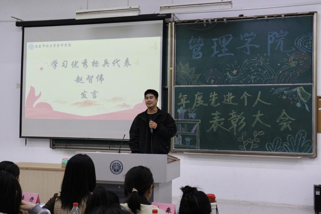 会上,学习优秀标兵代表赵智伟同学上台发言,他结合自身学习经历,分享了高效的学习方法、时间管理技巧与成长感悟,鼓励同学们以榜样为力量,明确目标、脚踏实地,在学业与成长中不断突破自我,赢得了现场同学们的阵阵掌声。
